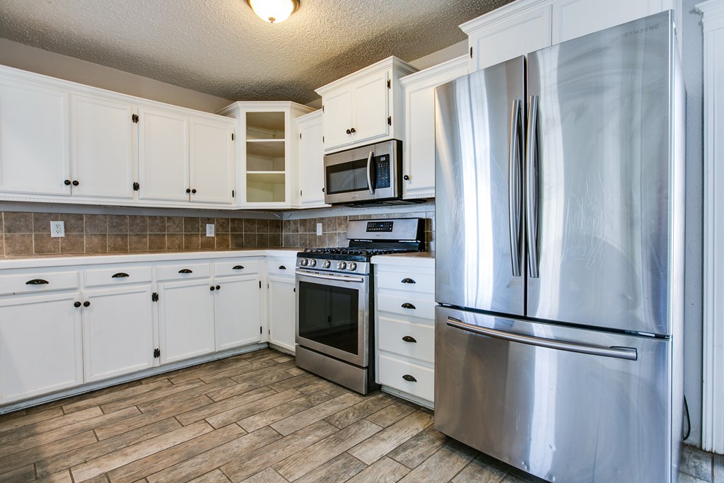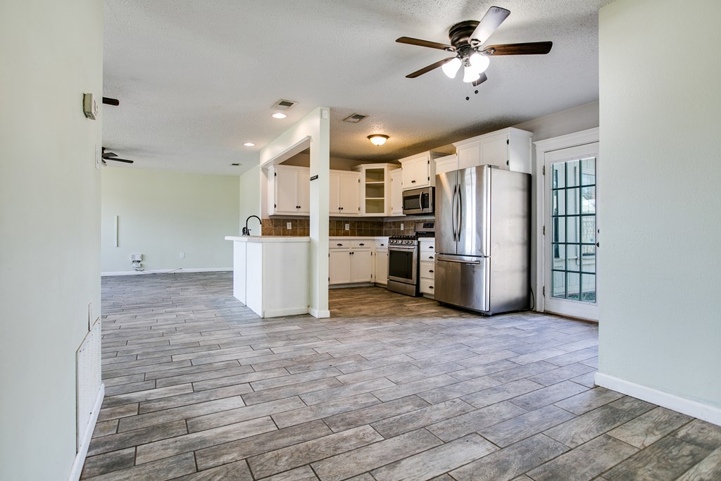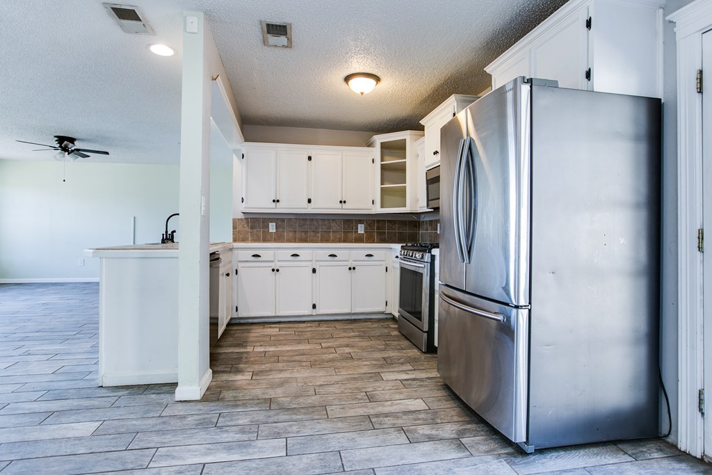 This charming brick-and-frame home offers a fantastic open, split-bedroom floor plan with plenty of space for everyone. Enjoy tile flooring throughout the main living areas, with cozy carpet in two of the bedrooms. The home features 2.5 bathrooms, including a convenient half bath in the fourth bedroom. At the heart of the home is a cute, functional kitchen that opens to the living and dining areas — complete with a breakfast bar, stainless steel appliances, and stylish white-painted wood cabinets. Step outside to a nice-sized backyard with a combination of metal and privacy fencing, plus a gate that allows alley access to the backyard.  Perfectly located right across from Bradford Elementary, this home blends comfort, convenience, and value.