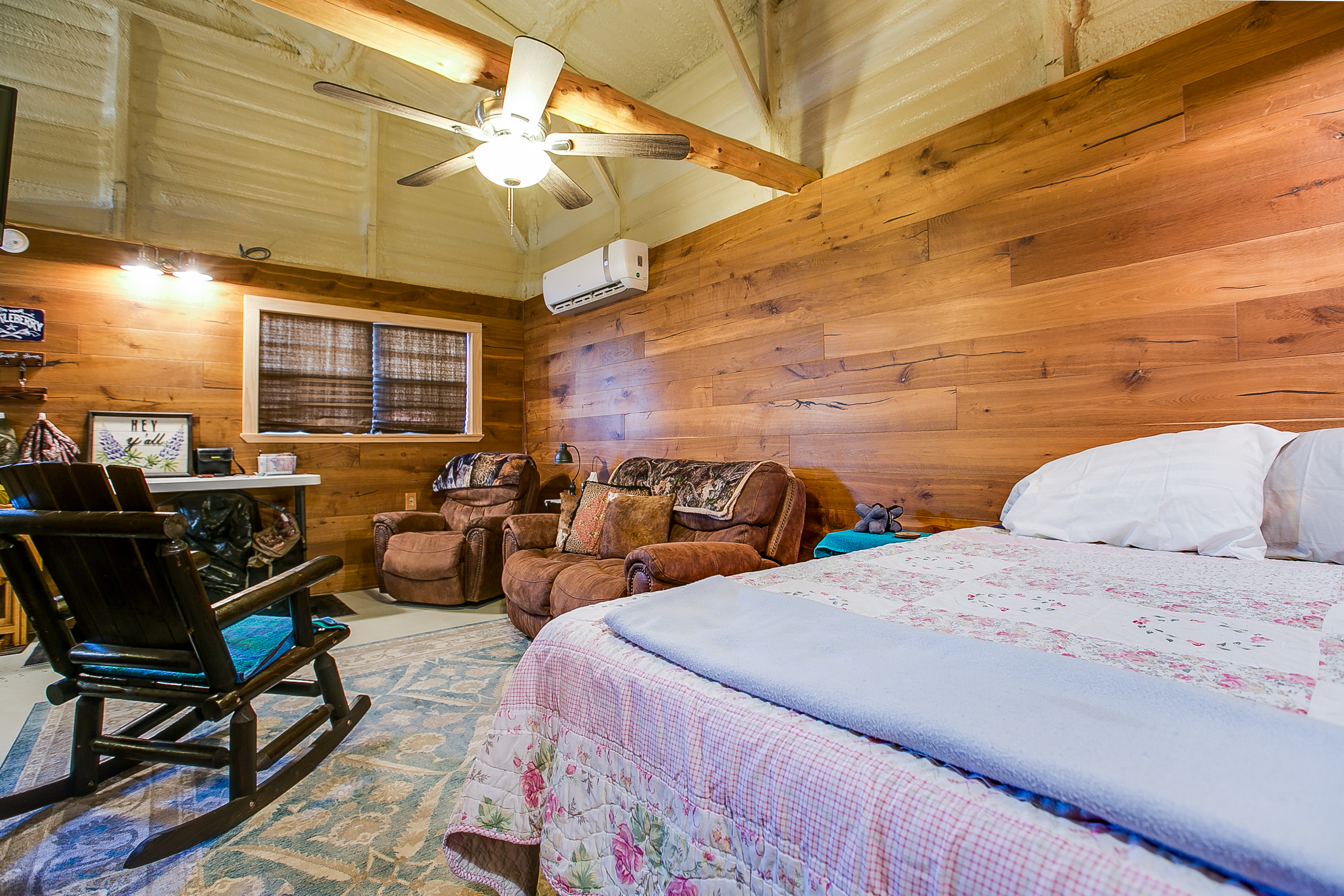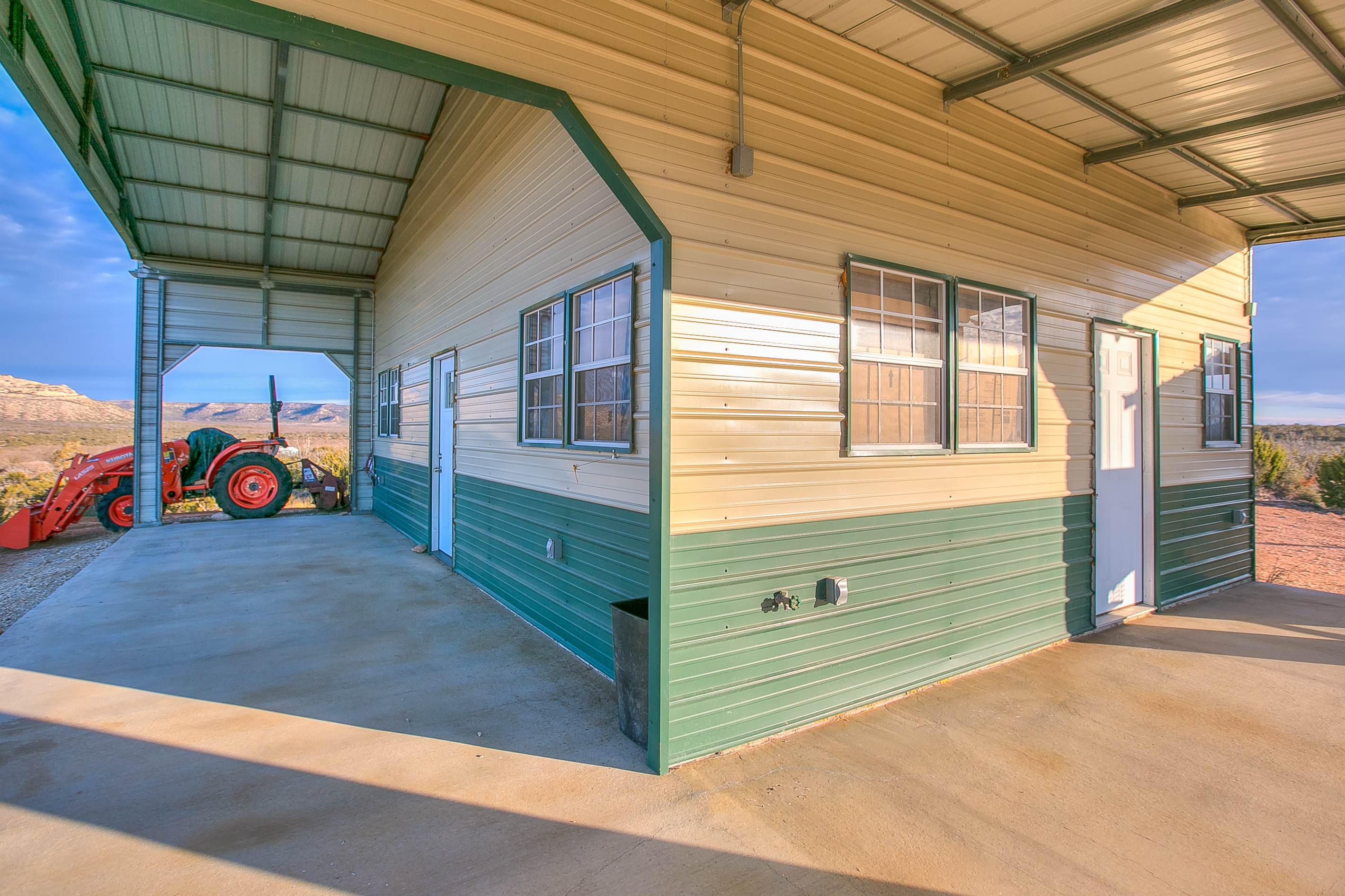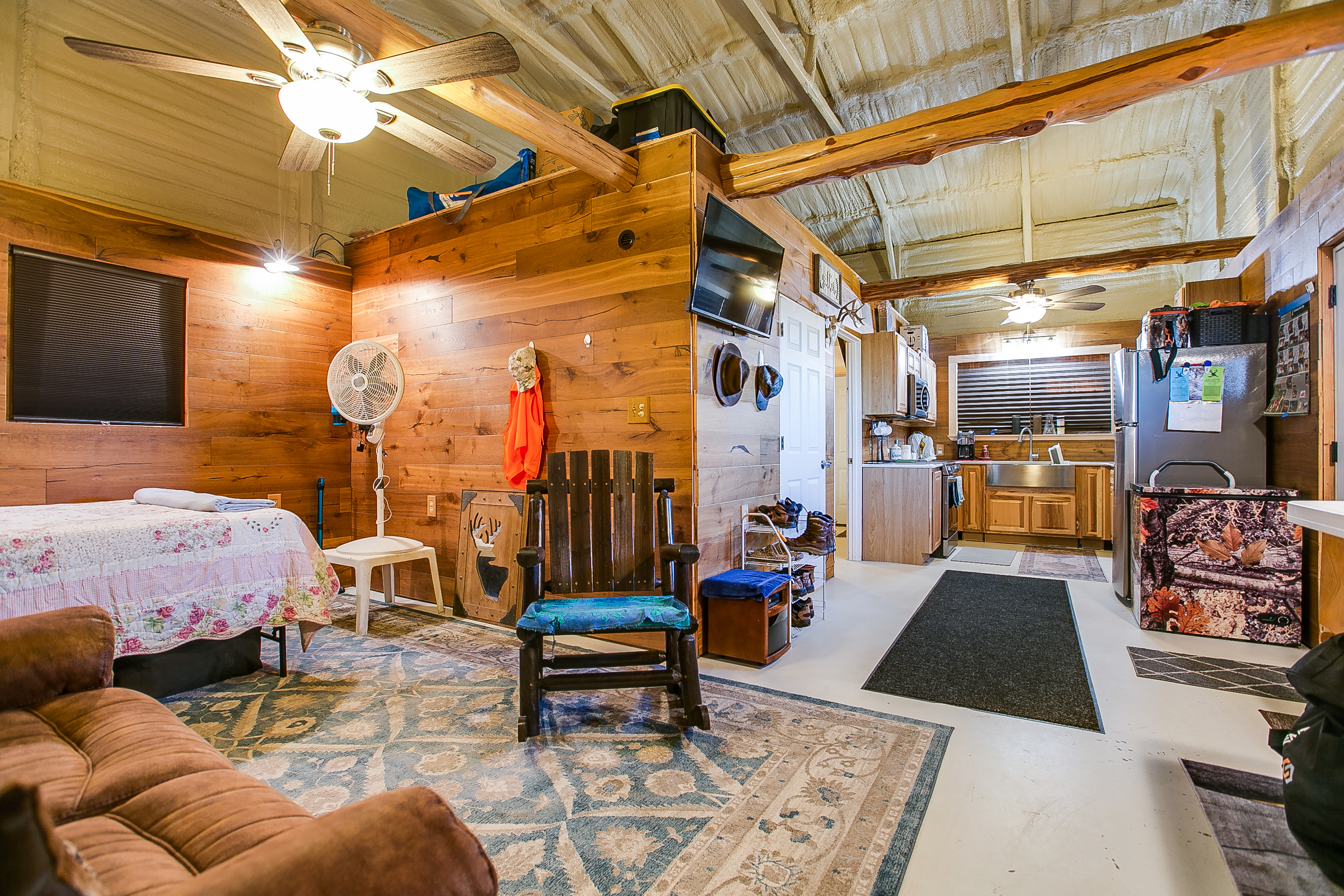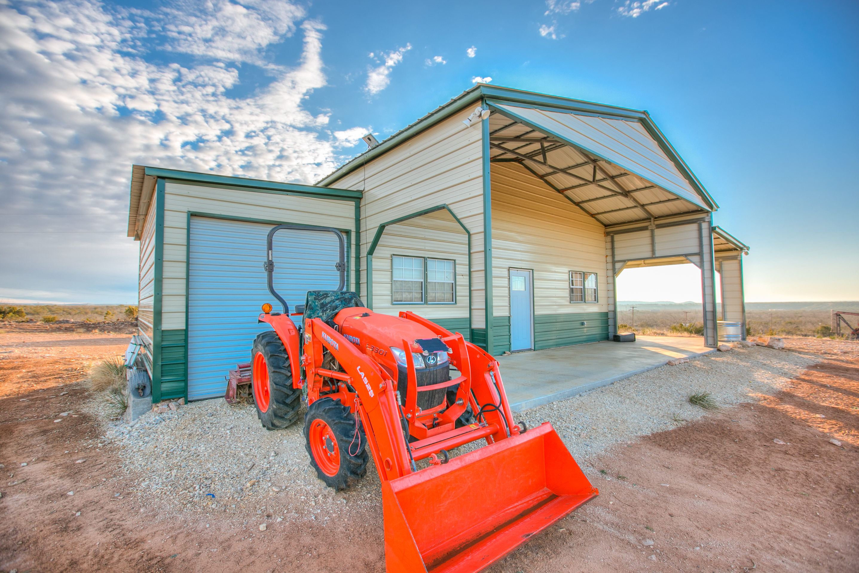 The property is improved with a 600± SF metal cabin featuring a porch along two sides. The cabin is a one-bedroom, one-bath weekend getaway with a living area and a loft used for storage. A garage is also located on the north side of the cabin and includes roll-up doors on each end for easy access. All improvements are well maintained and in excellent condition.